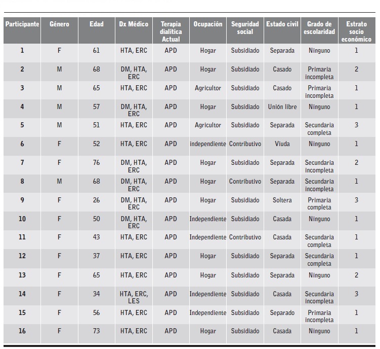 Fueron criterios de inclusión: 1. Adulto que acepte participar en la investigación y que firme el consentimiento informado, 2. Diagnóstico de enfermedad renal crónica terminal, vinculados al programa de diálisis peritoneal. 3. Sin déficit cognitivo o enfermedad mental. 4. Residentes en Neiva (Colombia) y sus alrededores.