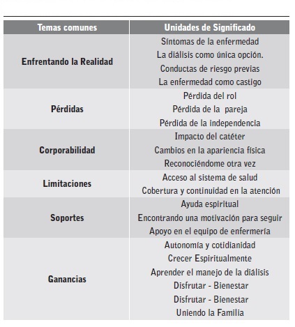 (P) 13, (E) 13 YMS.El tema común Ganancias, describe la transformación que realiza el paciente luego de aceptar su condición de enfermedad y como logra involucrar su terapia dialítica a su vida, permitiéndole reincorporarse poco a poco a su cotidianidad. Las unidades de significado autonomía y cotidianidad, crecer espiritualmente, aprender el manejo de la diálisis, disfrutar- bienestar y uniendo la familia, describen como la persona enferma logra trascender ante la adversidad, el enfermo experimenta autonomía al tener una terapia ambulatoria permitiéndole realizar sus actividades diarias, se ve la importancia de fomentar el auto cuidado, la familia y el cuidado principal se convierten en un aliado para el profesional de Enfermería para que el sujeto de cuidado se re encuentre así mismo a través de la diálisis peritoneal.
