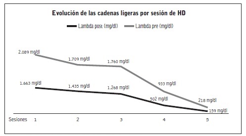Todo esto permitió que mantuviera el filtrado glomerular aunque no mejoró, probablemente por tratarse de un caso de mieloma recidivante. La evolución de las cadenas ligeras se muestra en la Figura 2.