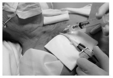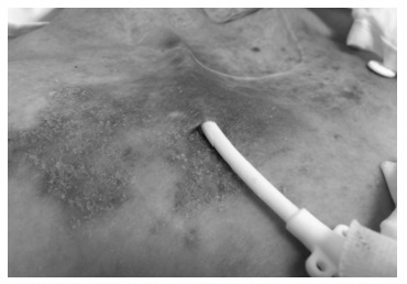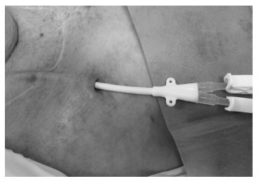 Se produjo un leve sangrado por el OSC, por lo que se realizó un cultivo de esta zona que resultó ser positivo para SAMS y hemocultivos que fueron negativos. Observamos una mejoría en las ampollas, pero persistió el eritema en la zona del túnel por lo que se decidió administrar durante la sesión de HD de forma tópica una solución de 500 mg de Vancomicina disuelta en 10 ml de suero en el trayecto tunelizado del CVCT. Para aplicarlo se utilizó un catéter muy fino (Abbocath® nº 26) que se introducía en el trayecto tunelizado del CVCT, así la solución de antibiótico impregnaba toda la zona del cuff (Figura 2). Tras cinco sesiones se observó que al presionar la zona cerca del OSC salía contenido sanguino-purulento, cuyo cultivo resultó positivo para SAMS, por lo que se decidió continuar con el tratamiento durante tres semanas más. Tras haber administrado la solución catorce veces remitió la infección, confirmándose por cultivos del exudado negativos. Continuamos aplicando los fomentos de ClNa 20%, en zonas cercanas al OSC durante varias sesiones para mejorar el aspecto de la piel y el prurito. Un año después, el CVCT se mantiene sin signos de infección y la piel presenta buen aspecto (Figura 3).