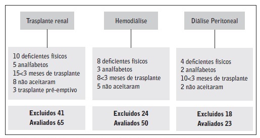 Aproximadamente 630 pacientes transplantados renais acompanhavam regularmente no ambulatório em que o estudo foi realizado, dos quais 65 participaram do presente estudo. Dos sujeitos em diálise, havia cerca de 88 em HD e 46 submetidos a DP, sendo que 50 e 23 pacientes participaram dessa pesquisa, respectivamente (Figura 1).