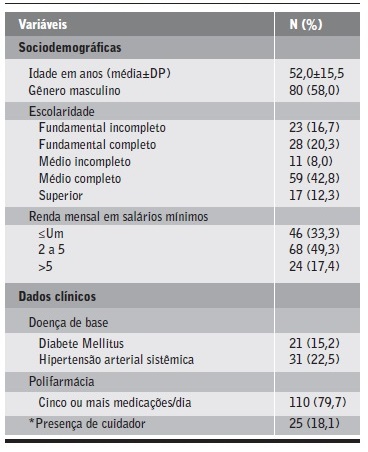Foram avaliados 138 pacientes com média de idade de 52,0±15,5 anos (intervalo 19 a 84 anos), a maioria com menos de 65 anos (76,1%), do gênero masculino (58,0%) e, mais frequentemente, com ensino médio completo (42,8%) e renda de dois a cinco salários mínimos (49,3%) (Tabela 1).