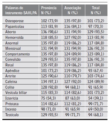 Quanto ao tempo de aplicação do instrumento SAHLPA, a média em minutos foi de 4,1±1,5. Para os pacientes com o letramento inadequado, o tempo de reposta dessa ferramenta foi 4,70±1,64 minutos, estando significativamente associado a esta classificação (P<0,001). A média do escore deste instrumento foi 13,7±3,8 pontos e a pronúncia foi o aspecto que os pacientes mais acertaram 45,7% (n=63), enquanto que, 28,3% (n=39) realizaram corretamente a associação e 26,1% (n=36) tiveram acertos iguais. As palavras que os participantes menos acertaram foram “icterícia” e “incesto” (Tabela 2).