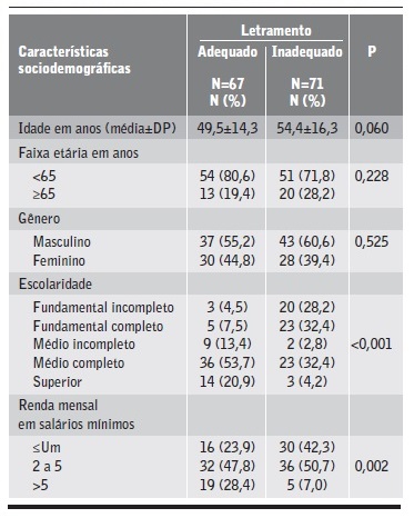 A maioria dos pacientes classificados como inadequados em relação ao LS, tinham renda igual ou inferior a um salário mínimo e ensino fundamental completo ou inferior, enquanto que, os indivíduos com letramento adequado, apresentavam, mais frequentemente, ensino médio incompleto ou maior escolaridade e renda de cinco salários mínimos ou mais (Tabela 3).