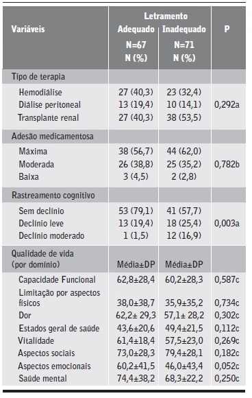 Resultados: foram avaliados 138 pacientes, sendo 50 (36,2) submetidos à hemodiálise, 23 (16,7%) a diálise peritoneal e 65 (47,1%) ao transplante renal. A média de idade foi 52,0±15,5 anos e 58,0% do sexo masculino. Os pacientes com letramento inadequado (51,4%) tinham renda igual ou inferior a um salário mínimo (P=0,002) e ensino fundamental completo ou inferior (P<0,001). Os indivíduos com letramento adequado apresentavam ensino médio incompleto ou maior escolaridade, renda igual ou superior a cinco salários mínimos e maior escore no domínio dos aspectos emocionais referente a qualidade de vida (P=0,052).