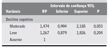 Considerando que renda e escolaridade apresentaram associação estatisticamente significativa com letramento, foi realizada uma análise multivariada ajustada para essas duas variáveis, na qual se encontrou que o declínio cognitivo não se manteve associado com LS (P>0,05) (Tabela 5).