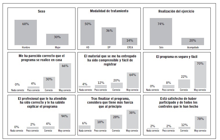 Resultados. : Participaron 62 pacientes. 24 estaban en programa de hemodiálisis, 17 en diálisis peritoneal y 7 en situación de enfermedad renal crónica estadio IV. 34 eran hombres. La edad media fue de 67,4±14,9 años. 52 pacientes realizaron el programa solos en su domicilio. 33 de los pacientes les pareció muy correcto que el programa fuera domiciliario, 15 correcto y 2 poco correcto. 47 de los participantes consideraron muy correcto que la persona que dirigiera el programa fuera una enfermera conocida. 19 consideró que tras el programa habían mejorado mucho, 14 que habían mejorado, 9 que habían mejorado poco y 3 que no habían mejorado. 39 estuvieron muy satisfechos de haber podido participar en el programa, 6 satisfechos, 1 poco satisfecho y 1 de los pacientes no estuvo satisfecho. No hubo diferencias significativas en las respuestas en relación al sexo, edad, tipo de tratamiento, o realizar el programa solo o acompañado.