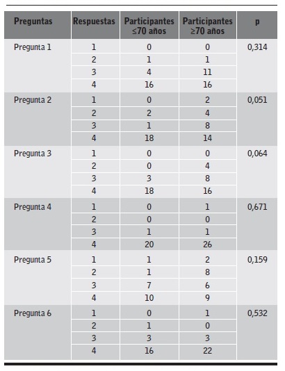 En nuestro, estudio podemos observar que la satisfacción por parte de los participantes es independiente de otras características como la edad y solamente casi alcanza la significación estadística (p=0,051), la pregunta 2, (¿el material es comprensible y fácil de registrar?), en la que hay diferencias entre las respuestas de los más jóvenes y los de edad avanzada, por esto consideramos que es necesario utilizar imágenes y registros muy asequibles pensando en las personas de edad, que frecuentemente tienen déficits visuales y les tiembla el pulso. Sin embargo, independientemente de este resultado podemos constatar que en nuestro estudio los PEFD pueden ser divulgados y practicados por todo tipo de persona con ERC independientemente de la edad y modalidad de tratamiento.