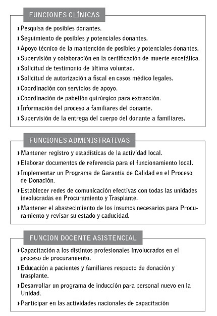 La actividad de coordinar y llevar a buen término todo el proceso de procuramiento, exige cada vez más contar con profesionales sanitarios competentes, con buena formación y capacitados para responder a cada una de las etapas de este proceso. Deben conocer; proceso, logística, legislación, fisiopatología, concepto de muerte encefálica, habilidad para mantener al donante potencial y nociones de bioética. Los potenciales donantes requieren de una mantención adecuada, cuidados de enfermería complejos, que solamente los puede otorgar personal altamente capacitado.