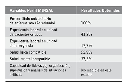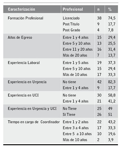 En referencia a las características profesionales, el 100% tiene título acreditado de enfermera, un 30 % entre 1 y 4 años de egresados, y un 37% menos de 5 años de experiencia laboral. El 75% de los profesionales de procuramiento, carecen de estudios de postgrado, no tienen experiencia en Servicio de Urgencia un 82%, sin experiencia en Unidad de Cuidados Intensivos un 59% y no tienen experiencia en Urgencia ni en Unidad de Cuidados Intensivos un 49%. El 77% con menos de 5 años en el cargo de coordinador local (Tabla 2).