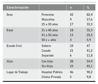De los 65 coordinadores presentes en el Congreso, 51 consintieron en participar (78%). Respecto a las características sociodemográficas, de ellos, un 82,4% son de sexo femenino, con un promedio de edad 36±11 años, un 41,2% se declara casado y el 54,9% con hijos. El 90,2% se desempeña en un Hospital Público. (Tabla 1).