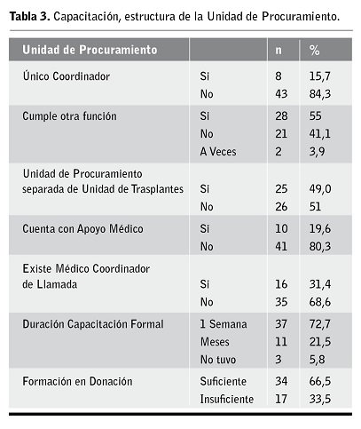 En cuanto al trabajo en el Servicio de Procuramiento propiamente tal, un 17% es el único Coordinador del Servicio, tiene reemplazo de su cargo un 84%, un 55% cumple otra función además de ser coordinador de procuramiento, respecto a contar con apoyo médico durante el proceso un 19%, cuentan con médico coordinador de llamada 31%. La Unidad de procuramiento funciona separada de la Unidad de trasplante un 47%. De acuerdo a la capacitación recibida previa a tomar el cargo, un 33 % encuentra que fue insuficiente y en cuanto a la duración de esta capacitación, para un 72% solo fue de una semana (40 horas). Además, los coordinadores, frecuentemente comparten su jornada laboral con otras funciones diferentes del procuramiento (59%) o con la unidad de trasplante del mismo hospital (51%) y no todos recibieron entrenamiento formal en sus funciones y quienes sí lo recibieron, éste fue de sólo una semana (Tabla 3).