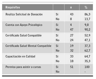 En relación a los requisitos del cargo, un 86,3% realiza solicitud de donación a los familiares, solamente un 9,8% cuenta con apoyo psicológico, un 52,9% con salud compatible certificada y un 37,3% con certificación de salud mental compatible para el cargo, por otra parte, un 64,7% tiene capacitación en calidad y un 100% tiene autorización para asistir a cursos (Tabla 4).