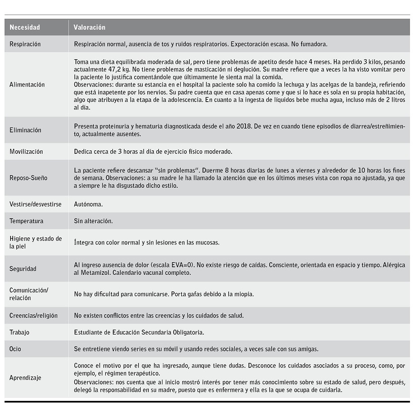 En segundo lugar, se realiza una valoración de la paciente siguiendo el modelo de valoración de las 14 necesidades de Virginia Henderson (ver Tabla 1). Los datos son recogidos el día anterior a la realización de la BR a través de una entrevista personal con la paciente y sus padres.