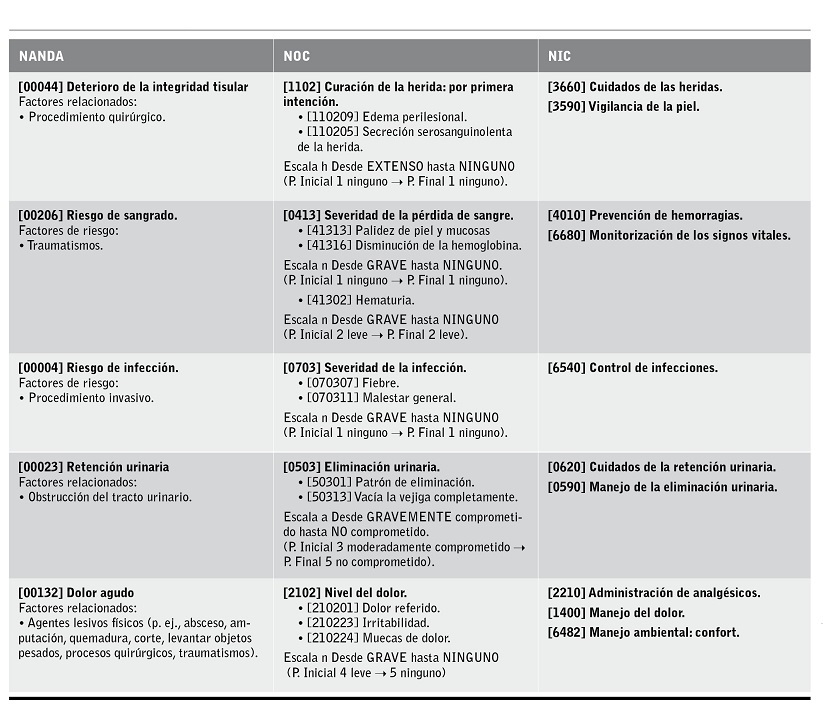Se detectó que la esfera psicosocial estaba gravemente comprometida en la etapa preoperatoria: la paciente se mostraba especialmente ansiosa al pensar en el dolor que suponía puncionarle y frustrada por no saber manejar su posible enfermedad, ya que se desentendía de la misma. Y, tras la práctica de la BR, se pudieron considerar como diagnósticos enfermeros de la paciente los que corresponden a “Deterioro de la Integridad Tisular”, “Riesgo de sangrado”, “Riesgo de infección”, “Retención urinaria” y “Dolor agudo” 8.