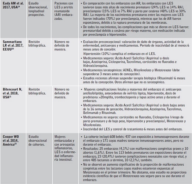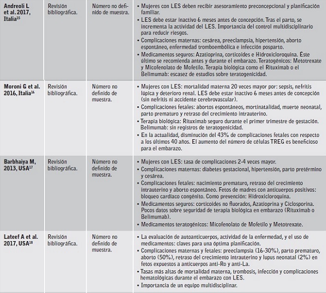 Results: 15 articles published between 2009 and 2019 have been included. Pregnancy in patients with systemic lupus erythematosus is complex. Comprehensive and continuous control is required to achieve good results. A change of treatment, laboratory tests from time to time and the monitoring of a multidisciplinary team will control the disease and will reduce the risk of maternal and fetal complications.