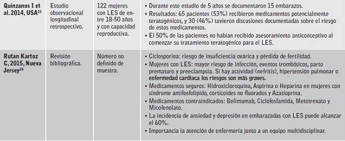 Algunos autores destacan la importancia del equipo multidisciplinar en el tema del embarazo en mujeres con LES, destacando la evaluación preconceptual de la enfermedad antes de la concepción, es decir, si se encuentra activa o no, así como el reajuste del tratamiento en cuanto a dosis y fármacos permitidos no teratogénicos27.
