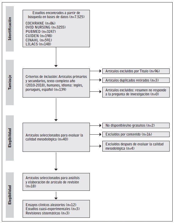 Para dar respuesta a la pregunta de investigación se realizó una búsqueda de artículos en las siguientes bases de datos: CUIDEN, CINAHL, COCHRANE, LILACS, PUBMED y OVID NURSING. Los criterios de elegibilidad de los estudios fueron: Revisiones sistemáticas, estudios cuasi-experimentales, ensayos clínico aleatorizados, publicados entre 2010 y 2018, en los idiomas español, inglés, portugués.