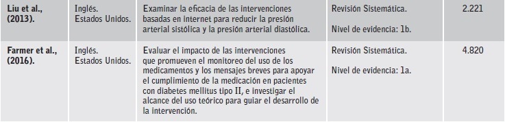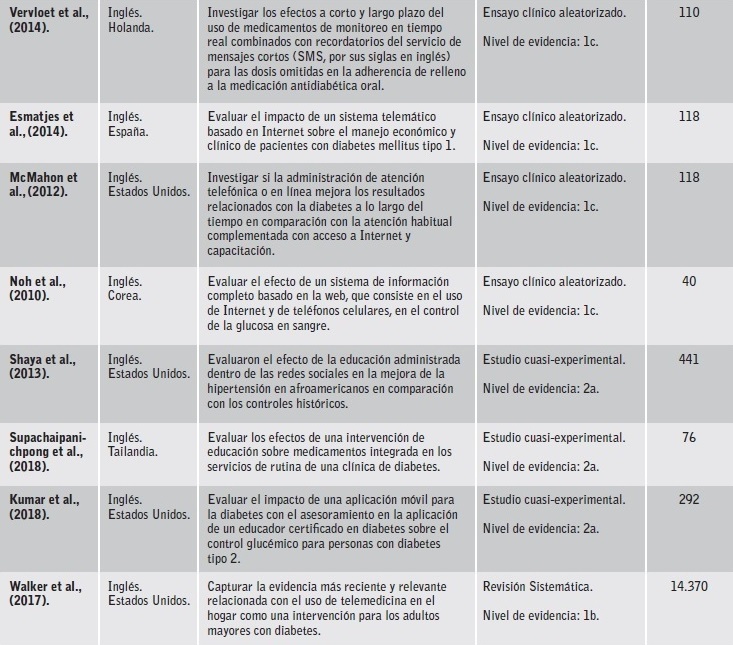 Con esta revisión sistemática se logró la síntesis de varios estudios que contenían el tema de interés acerca de la efectividad del uso de las TICs en la adherencia terapéutica en personas con diabetes mellitus e hipertensión arterial. Los estudios incluían estrategias de educación y seguimiento a través de portales web, mensajería de texto y llamadas telefónicas, con el fin de alcanzar los objetivos terapéuticos establecidos para el manejo de estas enfermedades que permiten implementar políticas, planes y programas de cuidado efectivos para la atención de este tipo de pacientes27. Los estudios incluidos son favorables en cuanto al grado de evidencia científica y fuerza de recomendación, encontrando que el 66,6% tuvo un nivel de evidencia 1 con recomendación c, el 16,6% tuvo un nivel de evidencia 2 con recomendación a, el 11,1% tuvo un nivel de evidencia 1 con recomendación b y el 6,6% tuvo un grado de evidencia 1 con recomendación a asignados según la propuesta del Instituto Joanna Briggs.