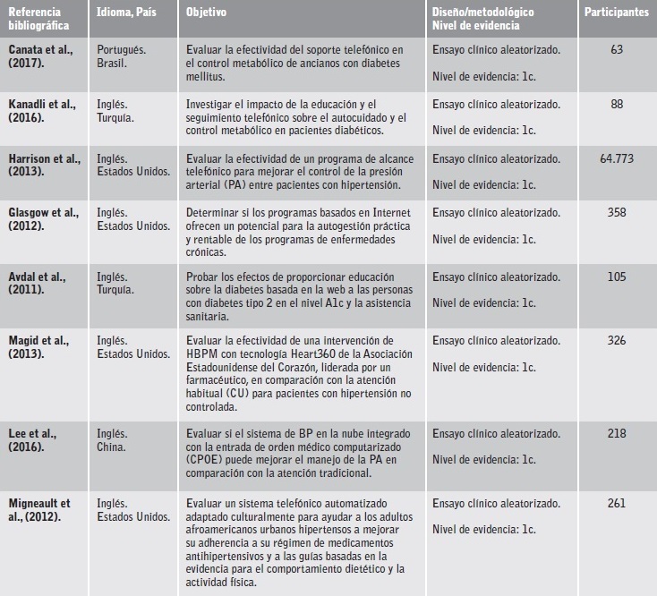 Se obtuvieron 18 artículos para lectura y análisis correspondientes al 66,6% de estudios controlados aleatorizados, 16,6% de estudios cuasi-experimentales y 16,6% de revisiones sistemáticas. El país que más reporta investigación en esta temática es Estados Unidos con 10 artículos; respecto al idioma se evidencia mayor publicación en inglés. Los años reportados de los artículos oscilan entre los años 2010-2018. La muestra agrupada de los 18 estudios incluidos fue de 24.058 individuos con hipertensión arterial y diabetes mellitus; la edad de rango de participantes fue de 18 a 89 años (ver Tabla 1).
