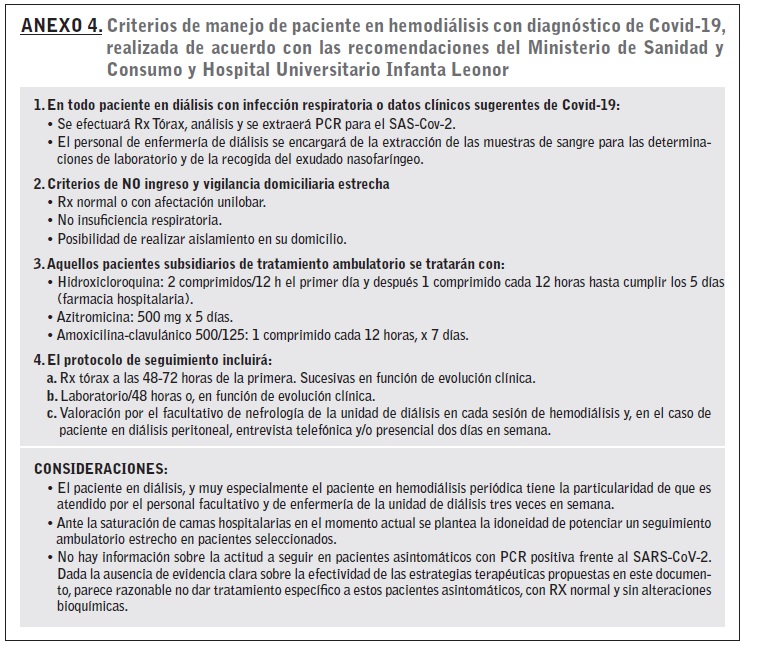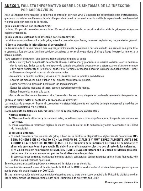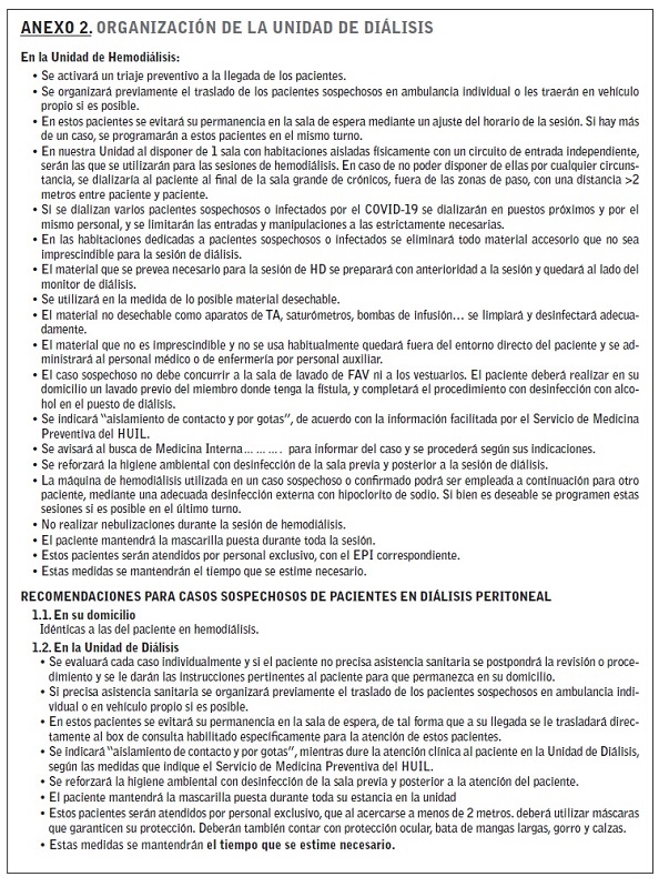 Arenas MD, Villar J, González C, Cao H, Collado S, Crespo M, et al. Manejo de la epidemia por coronavirus SARS-CoV-2 (COVID 19) en unidades de hemodiálisis. Nefrologia. 2020. https://doi.org/10.1016/j.nefro.2020.04.001.