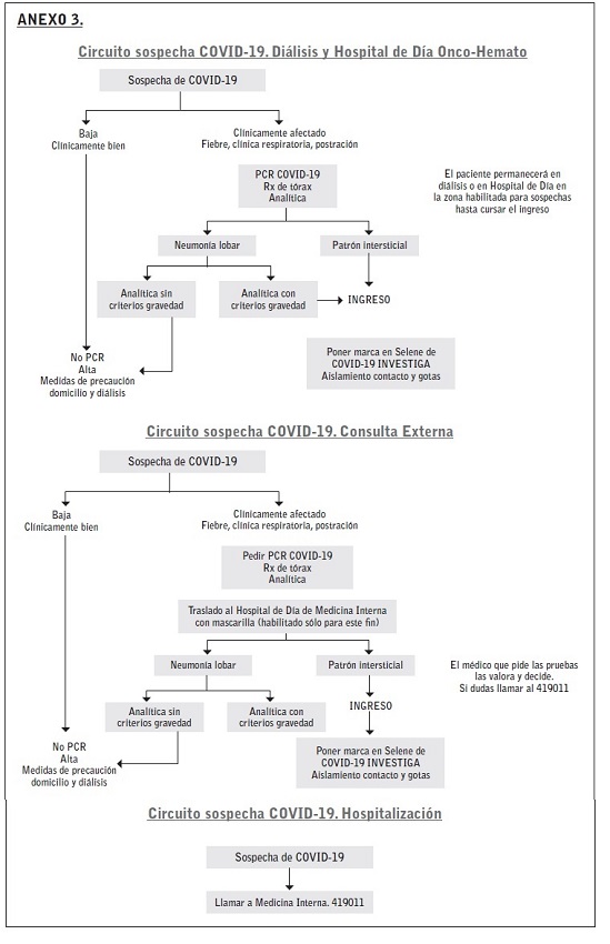 Los primeros días, ante la sospecha clínica en el triaje o en la sala de hemodiálisis había que avisar a los médicos de medicina interna y el paciente se derivaba al servicio de urgencias al finalizar la sesión para valoración y diagnóstico. Ante el colapso del servicio de urgencias a partir del día 13 de marzo (día 10), se habilitó un circuito de entrada directa para diagnóstico, evaluación de ingreso y tratamiento en el propio servicio de nefrología. Ante la sospecha clínica se procedía a seguir el algoritmo recogido en el Anexo 3.