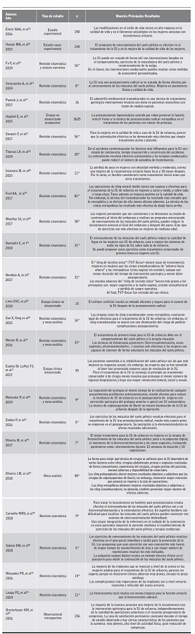 Resultados: Se incluyeron 26 artículos: 5 estudios experimentales, 18 revisiones sistemáticas y 3 metaanálisis. La incontinencia urinaria está relacionada con la edad, sexo y factores de riesgo, dependiendo del tipo e intensidad de la incontinencia, y características propias del paciente. El abordaje es interdisciplinar, con técnicas menos invasivas al principio, entre las que destacan la terapia conductual y los ejercicios del suelo pélvico; necesitándose cirugía en algunos casos, según las circunstancias individuales de los pacientes y/o la no existencia de mejoría con las técnicas menos invasivas.