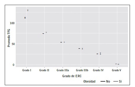 Se concluye que se encontró asociación entre obesidad e incremento de la TFG solo en estadios de ERC I y II. El perímetro abdominal, la tensión arterial no controlada y el LDL fueron variables que influyen en el promedio de la TFG, pero igualmente tienen un comportamiento diferente por grado de ERC.