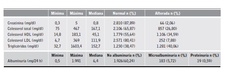 En cuanto a las pruebas de función renal, el 2,06% (n=66) tuvo la creatinina alterada, teniendo un promedio de 0,84±0,28 mg/dl. El 6,31% presentó alteración de la albuminuria, siendo más frecuente la microalbuminuria (5,72%) y la proteinuria (0,59%).