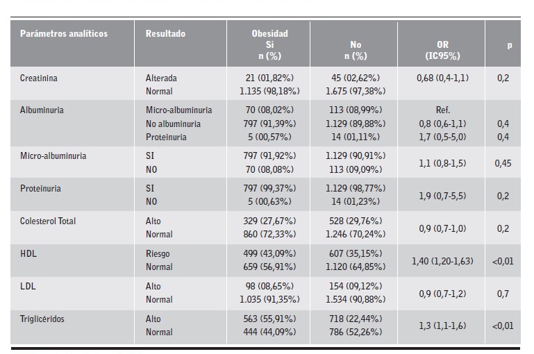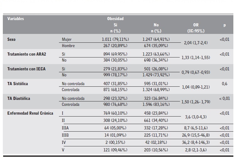 Se encontró asociación estadísticamente significativa entre la obesidad y el sexo femenino (OR:2,04; IC:95%:1,7-2,4), la tensión arterial diastólica no controlada (OR:1,50; IC:95%:1,26-1,79), la indicación de ARA2 (OR:1,33; IC:95%:1,14-1,55), y el hecho de no tener indicado IECA (OR:0,79: IC:95%:0,67-0,93). También se observó que a medida que progresa la enfermedad renal crónica en sus estadios, se incrementa el riesgo de tener obesidad en los pacientes que presentan hipertensión (Tabla 2). En cuanto a sus parámetros analíticos, el HDL en riesgo (OR:1,40; IC:95%1,20-1,63) y los triglicéridos altos (OR:1,3: IC:95%1,1-1,6) fueron más frecuentes en pacientes con obesidad. (Tabla 3).