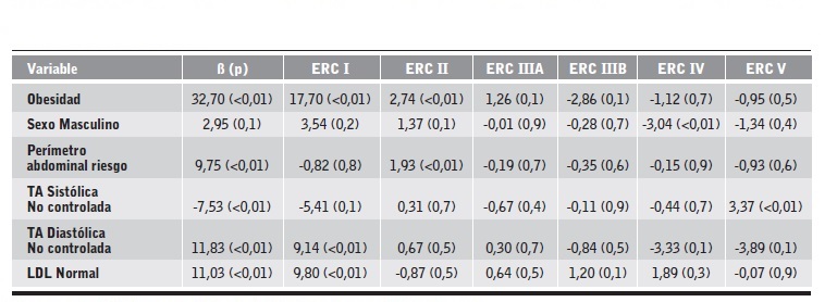 Conclusión: Existe asociación entre obesidad e incremento de la tasa de filtrado glomerular solamente en estadios I y II. El perímetro abdominal, la tensión arterial no controlada y el LDL fueron variables que influyen en el promedio de la tasa de filtrado glomerular, pero tienen un comportamiento diferente por grado de enfermedad renal crónica.