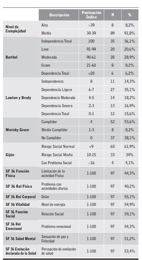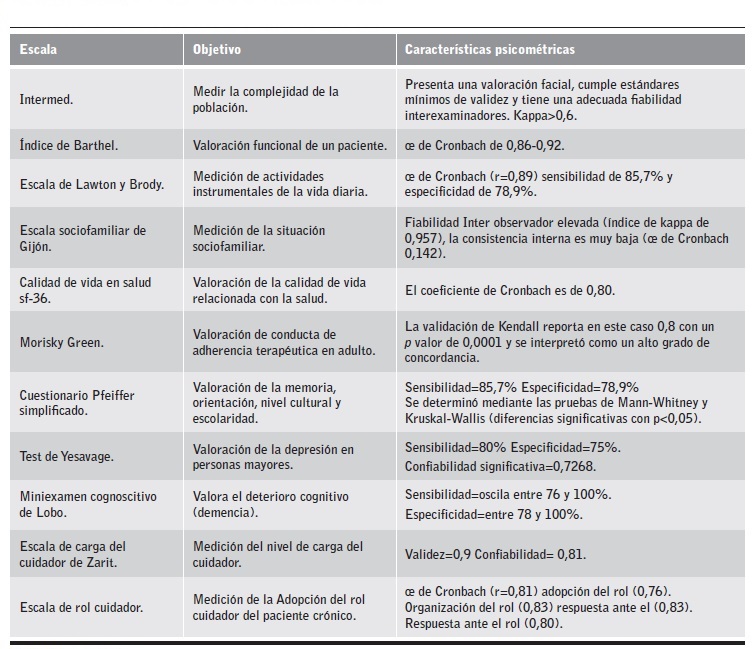 Los datos se obtuvieron en visitas domiciliarias individuales a pacientes y cuidadores familiares, realizadas por enfermeras gestoras de caso que recibieron entrenamiento. Se realizaron valoraciones multidimensionales (clínica, funcional, psicoafectiva, cognitiva y sociofamiliar) utilizando los instrumentos validados que se describen en la Tabla 2.