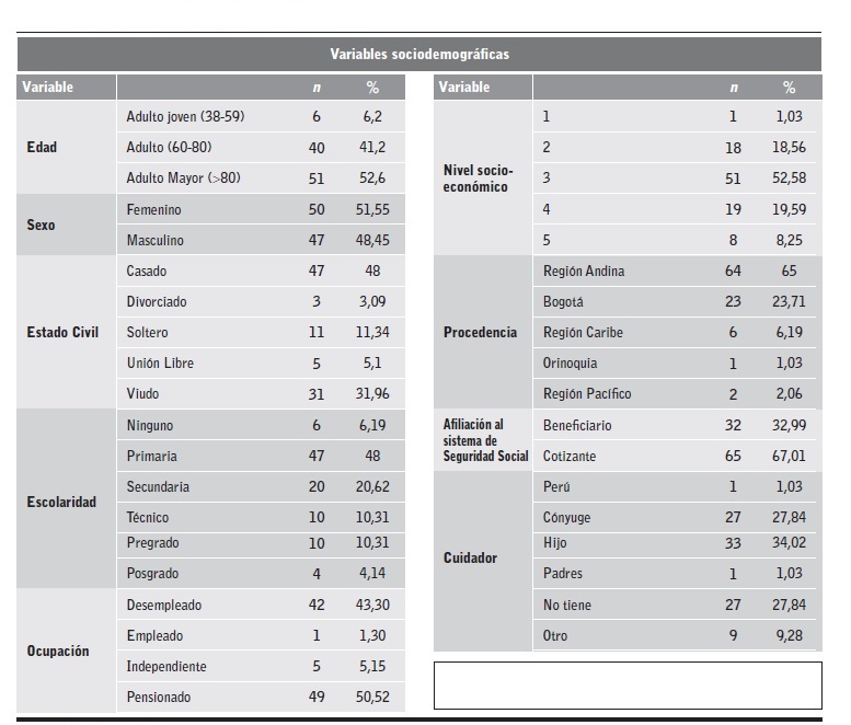 De 97 personas incluidas 50 (51,5%) fueron mujeres, el rango de edad fluctuó entre 38 y 102 años, con una mediana de 70 años. La mayoría (48%) están casados, y el 48%, cursaron primaria completa (Tabla 3).