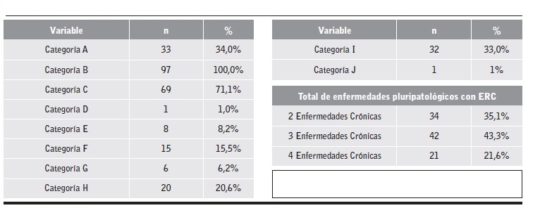 El presente estudio examinó las características sociodemográficas y clínicas en una población con pluripatología y ERC; el 43,3% presentó tres enfermedades crónicas asociadas, el 35,1% dos y el 21,6% cuatro patologías, resultados acordes con los hallazgos de Monteverde et al. quienes, en el modelo agrupador de morbilidad para la provincia de Cataluña en España, encontraron una distribución del 75% de la población con multimorbilidad y 42% de estas con algún tipo de patología crónica13.