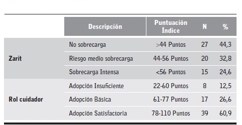 El estudio reportó que el 91,5% de los pacientes presentaron un nivel de complejidad media, y un 8,25% complejidad alta; por otra parte, los principales cuidadores de los participantes fueron los hijos (34,02%), seguido de los cónyuges (27,84%), y en menor porcentaje sus propios padres. Todos los cuidadores son mayores de edad y asumen la ejecución de un nuevo rol para contribuir de manera primordial al bienestar de la persona con enfermedad, el nivel de sobrecarga intensa del cuidador se presenta en un 24% de la población, generando afecciones en relación a sus tareas de cuidado, lo que podría interferir con el estado de ánimo causando así repercusiones negativas. En cambio la adopción del rol cuidador en este estudio es de un 60,9% lo que indica una transición saludable hacia la labor óptima de ser cuidador a nivel cognitivo, comportamental e interpersonal, en un 12,5% el cuidador se enfrenta a cambios inesperados con afectaciones laborales, financieras, organizacionales y dinámica familiar que requieren de estrategias de afrontamiento (Tabla 6). Esto es de gran importancia en enfermería, pues indica la conveniencia de incluir dentro de sus cuidados no solo al paciente, sino también a su familia, especialmente, al cuidador principal.