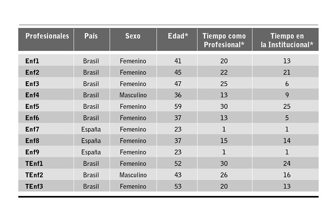 La población de estudio estuvo compuesta por profesionales del equipo de enfermería y la muestra se estableció por conveniencia, mediante invitación directa a los informantes. Ésta estuvo conformada por 12 profesionales y el tamaño muestral no estaba preestablecido, es decir, no se buscaba la representatividad estadística sino la teórica, de manera que cuando se alcanzó la saturación de datos se detuvo la recogida de los mismos. Los criterios de inclusión fueron profesionales del equipo enfermería con uno o más años de experiencia en la institución donde trabajan, en los diferentes turnos de atención, que realizaron sus actividades durante el período de recolección de datos. Los criterios de exclusión aplicables fueron no proporcionar asistencia directa a los pacientes durante el período de investigación.