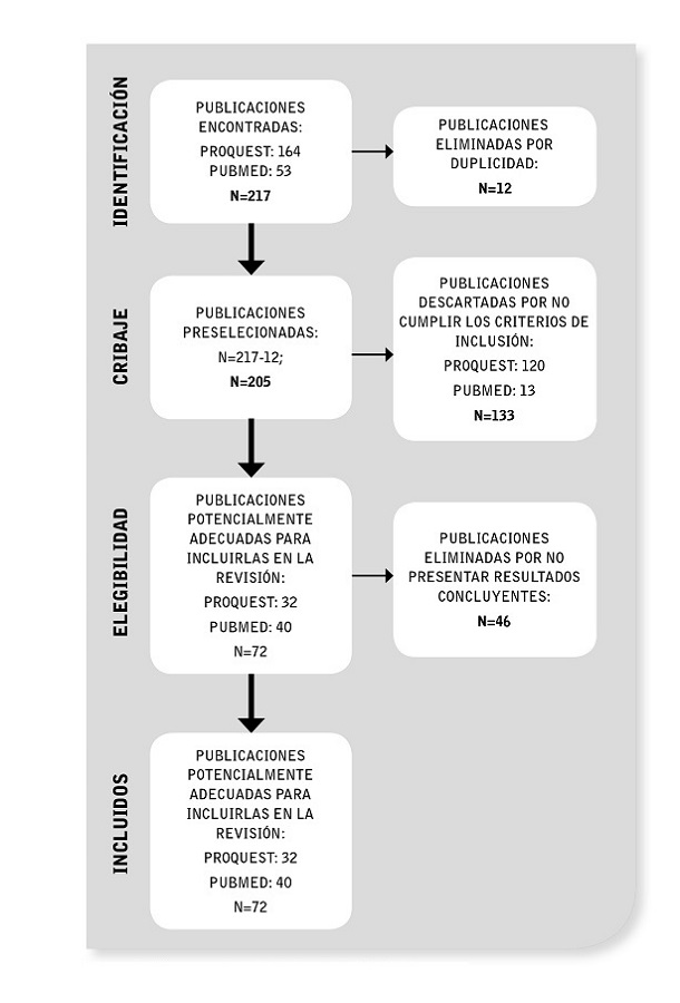 Al incluir la estrategia de búsqueda en las bases de datos referidas se encontraron 217 artículos. Se eliminaron los manuscritos duplicados (12), quedando 205 para la lectura de título y resumen. Una vez revisado el título y resumen se eliminaron 133 manuscritos, quedando para lectura completa 72 artículos. Tras la lectura a texto completo, se excluyeron 46 artículos de los 72. Finalmente fueron 26 los artículos seleccionados.