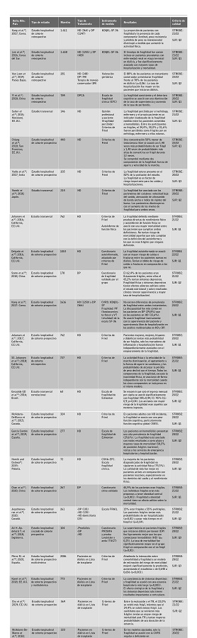 En cuanto a la tasa de hospitalización, en diferentes artículos de esta revisión se ha encontrado una relación significativa con la presencia de fragilidad, como mayor hospitalización, mayor duración de estancia hospitalaria y mayor gravedad de motivo de ingreso25, resultados coincidentes con las conclusiones de una revisión sistemática del año 201712. Los pacientes en lista de trasplante que tenían mayor fragilidad antes del trasplante tenían un mayor riesgo de estancia hospitalaria41), (42, en la línea de lo publicado por otros autores que comunicaron que los pacientes frágiles que se trasplantan, suelen tener una hospitalización más prolongada y con mayores complicaciones52)-(54.