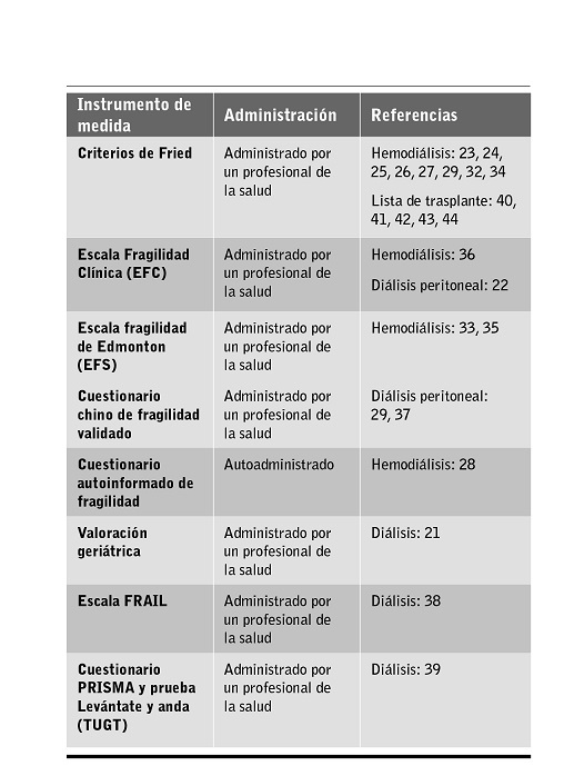 Se extrajeron las siguientes variables de los artículos seleccionados: autor, año, país, tipo de estudio, muestra, procedimiento dialítico, instrumento de medida de fragilidad, resultados principales y calidad de la evidencia.