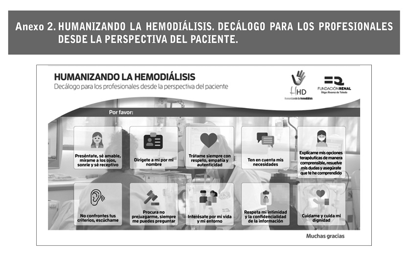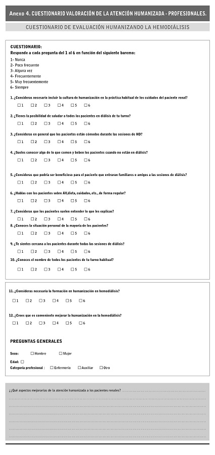 Conclusions: There has been a significant increase in patient satisfaction about the information provided by the professionals and their proximity. Very positive values have been verified regarding the humanising care received by patients and their comfort during hemodialysis sessions. On the other hand, the professionals consider training in the field of humanisation to be necessary and believe that it would be advisable to improve it in the units.