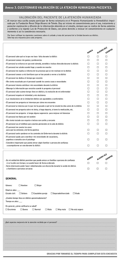 Tras una extensa búsqueda bibliográfica en la que no se obtuvieron resultados acerca de la existencia de escalas o cuestionarios para valorar la humanización en las unidades de hemodiálisis, se diseñaron y validaron dos cuestionarios ad hoc elaborados por un panel de expertos que consensuaron los cuestionarios (con una escala de respuesta tipo likert) que se consideraron definitivos tras ser sometidos a una prueba piloto.