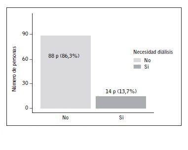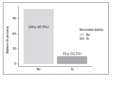 En la figura 1 podemos ver el número de pacientes que necesitaron diálisis respecto al total. De los 22 pacientes a quienes habían retirado el catéter en el momento del trasplante, 2 (1,6% de 124 pacientes) necesitaron hemodiálisis; de los 102 pacientes a quienes no habían retirado el catéter peritoneal, 13 (10,5% de 124 pacientes) necesitaron algún tipo de diálisis, de los que 10 (8% de 124 pacientes) fueron diálisis peritoneal.