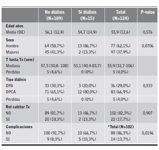 Las variables analizadas fueron: edad en el momento del trasplante renal; sexo; tiempo en diálisis, considerado desde el inicio en domicilio hasta el trasplante renal; tiempo hasta retirada del catéter; necesidad diálisis, considerada esta como la realización de diálisis después del trasplante renal; tipos de diálisis (hemodiálisis y/o diálisis peritoneal); complicaciones relacionadas con la diálisis peritoneal.
