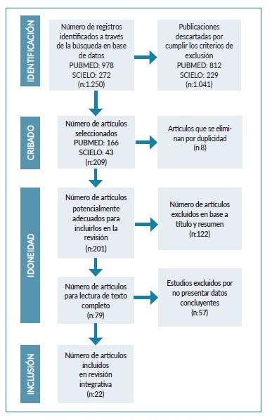 En primer lugar, se realizó una primera búsqueda sin considerar ningún criterio de inclusión ni de exclusión, con el fin de conocer la cantidad de publicaciones existentes y obtener así la mayor información posible sobre el tema a estudiar. En esta primera búsqueda, se encontraron 1.250 artículos. Después de incluir la estrategia de búsqueda en las bases de datos referidas, se encontraron 209, los cuales cumplían los criterios de inclusión. Se eliminaron los 8 manuscritos duplicados, quedando 201 para la lectura de título y resumen. Una vez revisado el título y resumen se eliminaron 122 manuscritos, quedando para lectura completa 79 artículos. Tras la lectura a texto completo, se excluyeron 57 artículos de los 79. Finalmente fueron 22 los artículos seleccionados.