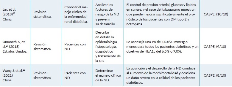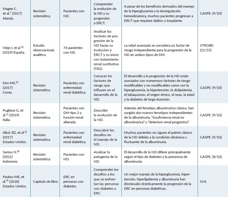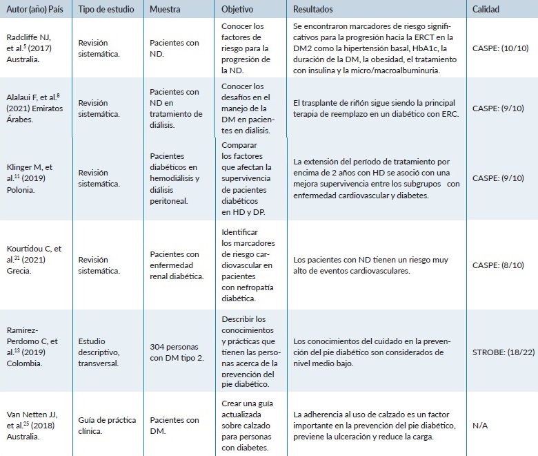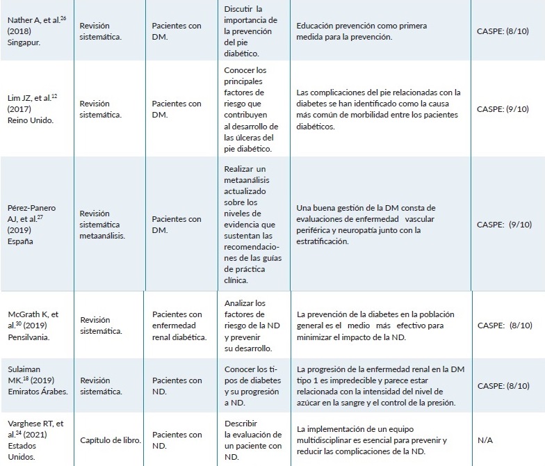 Resultados: Se seleccionaron 22 artículos. De ellos, 17 fueron revisiones sistemáticas, 1 guía de práctica clínica, 1 estudio descriptivo transversal, 1 estudio observacional analítico, y 2 capítulos de libro. De la revisión emergieron las siguientes variables: tipo de diabetes, edad, evolución, tipo de tratamiento renal sustitutivo, pie diabético y prevención.