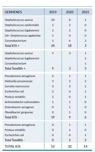 Aunque no es el objeto de este estudio, detectamos 1 IOS por Corynebacterium en 2019 (2%), en 2020 las IOS producidas por Corynebacterium fueron 6 (18,7%) en 2021 fueron 3 (21,4%). En la tabla 1 se muestran los gérmenes responsables de las IOS de 2019, 2020 y 2021.