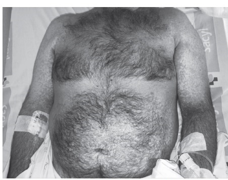 Varón de 46 años que acude a urgencias por presentar exantema generalizado no pruriginoso de 2 semanas de evolución, sin afectar a miembros inferiores, plantas y palmas (figura 1). Refiere fiebre intermitente de hasta 40ºC, pérdida de peso de 4 kilos y presenta adenopatías retro y preauriculares, sudoración nocturna y diarrea líquida sin productos patológicos desde inicio del cuadro. Durante la entrevista clínica el paciente comenta la toma previa de alopurinol, prescrito el mes previo por su médico de atención primaria, al presentar hiperuricemia en la última analítica. El tratamiento fue suspendido tras el comienzo de la clínica cutánea. El paciente ingresa a cargo del servicio de digestivo, diagnosticado de hepatitis aguda.
