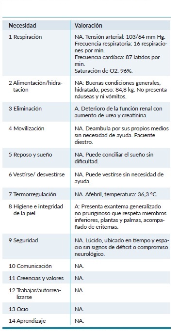Tras el ingreso del paciente en la unidad de nefrología, se llevó a cabo una valoración de enfermería siguiendo el modelo de las 14 necesidades de Virginia Henderson (tabla 1).