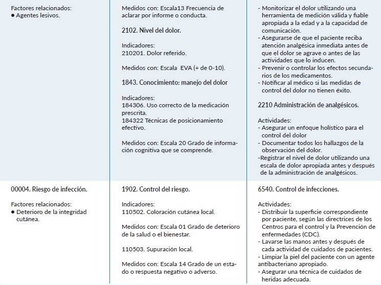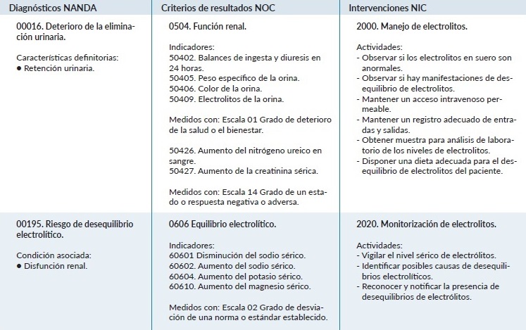 Se establecieron 3 diagnósticos reales: deterioro de la eliminación urinaria, deterioro de la integridad cutánea y dolor agudo; y 2 diagnósticos de riesgo: riesgo de desequilibrio electrolítico y riesgo de infección.