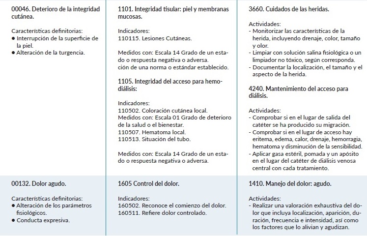 Como criterios de resultados esperados para los diagnósticos reales se implementaron: la mejora de la función renal, la integridad tisular y del acceso vascular, así como el control de dolor teniendo presente los niveles del mismo y la capacidad cognitiva del paciente para su control. Y para los diagnósticos de riesgo: conseguir un óptimo equilibrio electrolítico, así como un control de los factores de riesgo, especialmente aquellos que podrían influir en la integridad tisular del acceso vascular utilizado para el tratamiento dialítico.